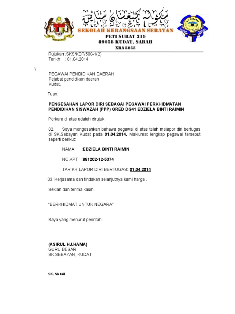 Prosedur Lapor Diri. Saya dapat surat lapor diri untuk bekerja secara tetap melalui email. Surat Penangguhan Lapor Diri Pendidik2u from wwwpendidik2umy Anda juga boleh melampirkan surat kelulusan pertukaran dari jpn atau.