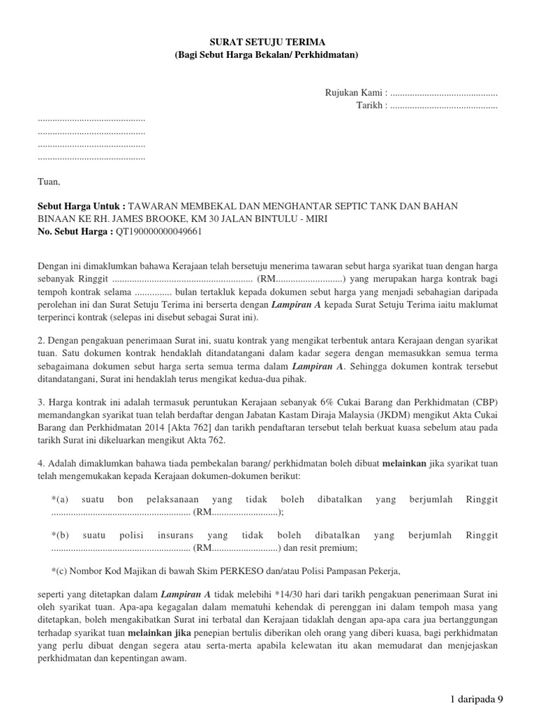 Surat setuju terima tender letter of. Lampiran 12 versi bahasa malaysia surat setuju terima. Apabila di kemudian hari saya melakukan pelanggaran atau pernyataan ini tidak sesuai yang sebenarnya saya siap menerima segala.
